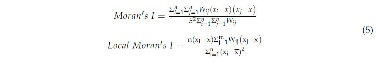 Анализ пространственной автокорреляции включает изучение того, коррелирует ли определенный атрибут в пределах пространственной единицы с тем же атрибутом в соседних пространственных единицах. Это отношение может быть количественно определено с помощью I Морана [42]. Анализ пространственной автокорреляции может быть категоризирован на глобальную пространственную автокорреляцию и локальную пространственную автокорреляцию. Глобальная пространственная автокорреляция оценивает общую степень пространственной зависимости в более широком пространственном диапазоне, в то время как анализ локальной пространственной автокорреляции концентрируется на исследовании локальных пространственных особенностей в пределах конкретной области исследования [43,44].