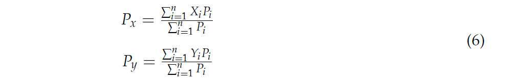 где ( (P_x, P_y) ) представляет долготу и широту центроида ССК за определенный год. ( X_i ) и ( Y_i ) представляют долготу и широту координат i-го региона, ( P_i ) представляет ССК ВЗР для соответствующего i-го региона, и ( n ) представляет общее количество регионов в пределах района исследования.