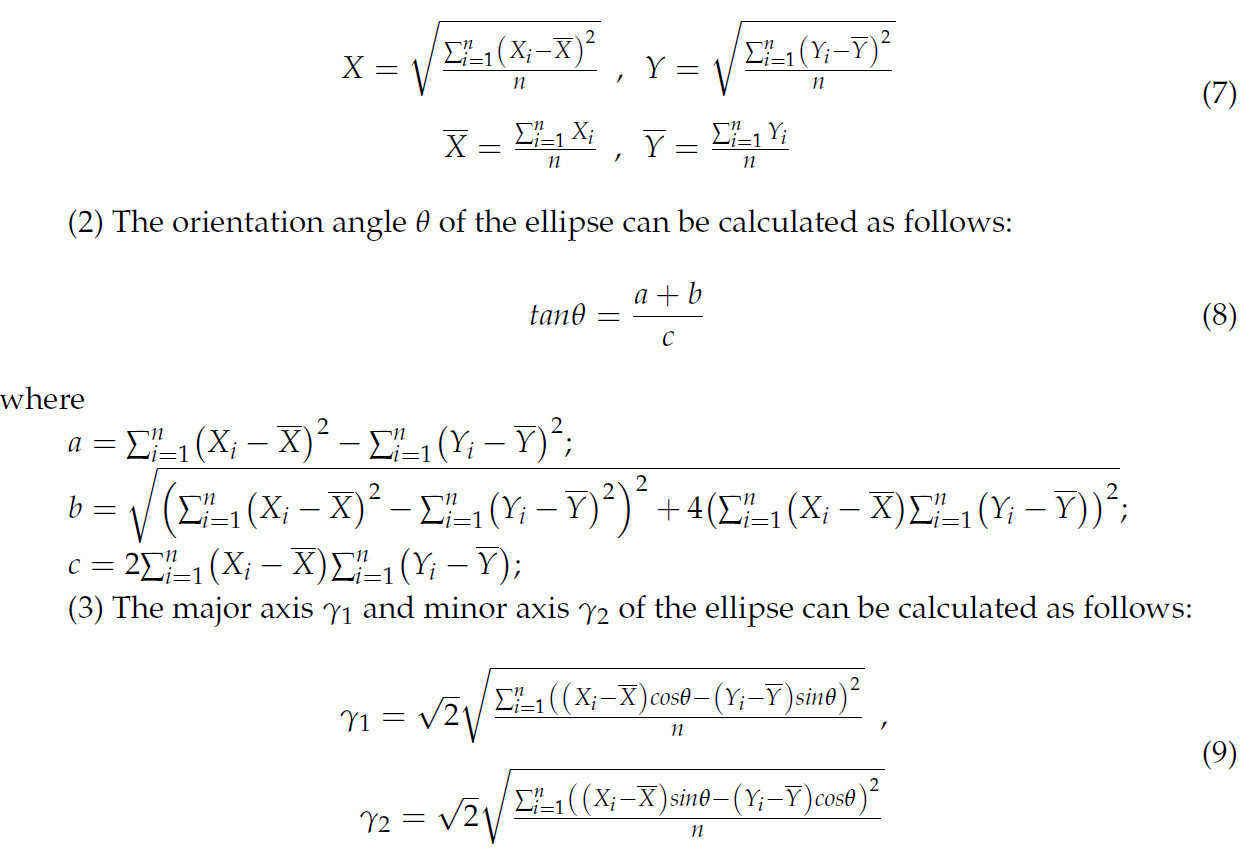 Инструмент эллипса стандартного отклонения (ЭСО) в ArcGIS был использован для иллюстрации пространственной тенденции распределения центроида относительно ССК. ЭСО — это геостатистический метод, который эффективно представляет пространственные характеристики распределения различных географических элементов [47]. Основные параметры ЭСО включают центр тяжести, угол ориентации и длинную и короткую оси. Центр тяжести круга означает средний центр данных, указывая относительное местоположение распределения данных в пространстве. Длинная и короткая оси представляют направление распределения и диапазон соответственно. Дополнительно, разница между длинной и короткой осями отражает степень направленности рассеянных точек. Угол ориентации обозначает угол вращения большой оси, измеренный по часовой стрелке от северного направления [48,49].