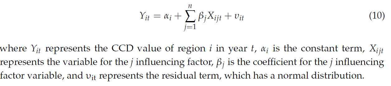 Модель Тобита — это метод регрессионного анализа, который обычно применяется для работы с цензурированными зависимыми переменными, эффективно управляя проблемами нижней и верхней границ. В отличие от моделей линейной регрессии, модель Тобита предлагает специфические преимущества при работе с цензурированными данными и ограниченными зависимыми переменными [50,51]. Основываясь на теоретической основе Уравнения (10), данное исследование использует программное обеспечение Stata (14.0) для анализа движущих факторов. Модель следующая: