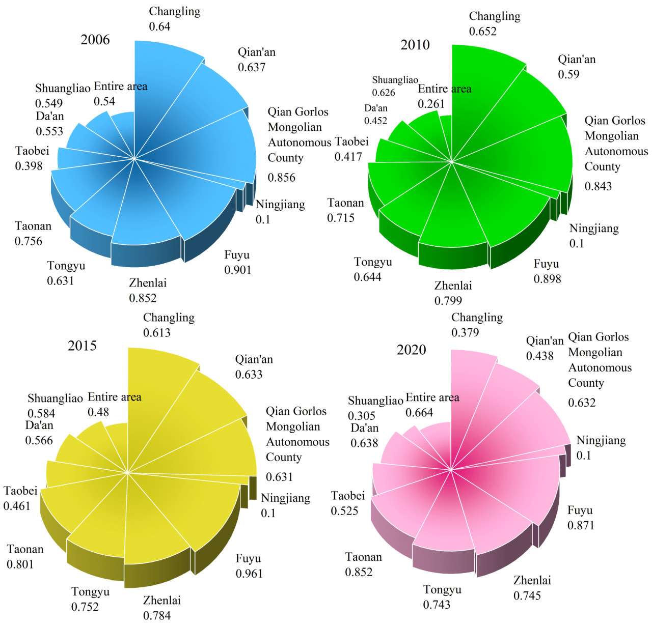 Как показано на Рисунке 4, ССК ВЗР в районе исследования с 2006 по 2020 год демонстрирует колеблющуюся восходящую тенденцию, переходя от умеренного дисбаланса к промежуточной координации. Эта тенденция предполагает все лучшее соответствие ВЗР в ЗПЦ. Среди четырех выбранных периодов ССК в районе Нинцзян остается постоянной на уровне 0,1, отражая условия серьезного дисбаланса. В отличие от этого, ССК в уезде Цяньань и уезде Чанлин демонстрирует снижение, в то время как вариации в ССК уезда Чжэньлай, города Фуюй и уезда Цяньго относительно незначительны. И наоборот, ССК в городе Даань, районе Таобэй, городе Таонань и уезде Тунюй показывает увеличение, указывая, что соответствие ВЗР в этих четырех регионах улучшается.