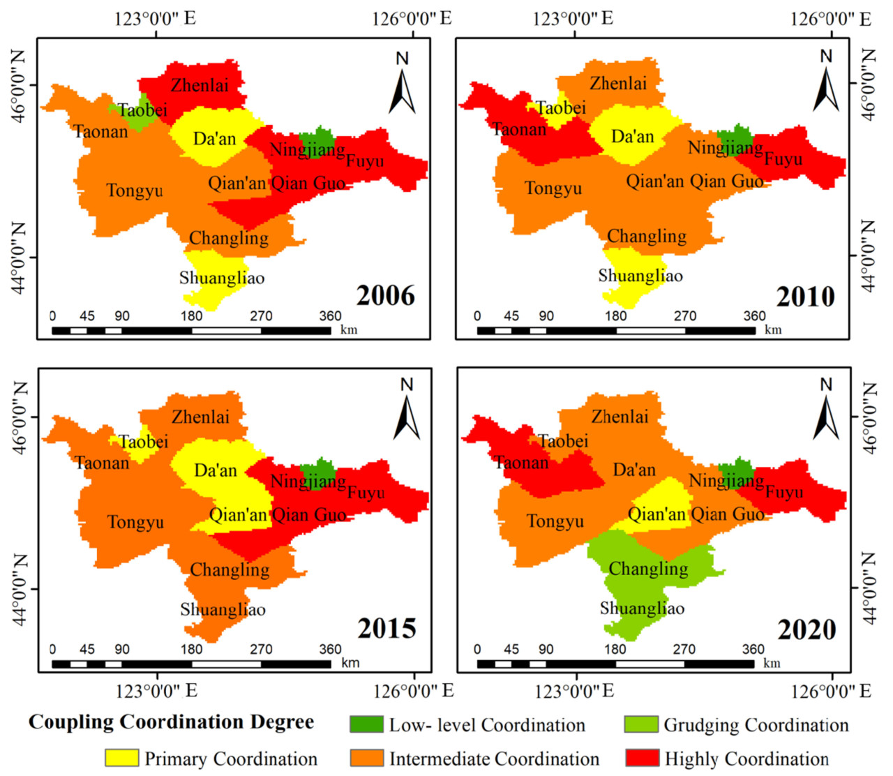 Что касается количества административных регионов на каждом уровне сопряженной координации, наиболее значительная доля была найдена в регионах с умеренной координацией. За период с 2006 по 2020 год наблюдалось небольшое снижение количества административных регионов, классифицированных как имеющие высокоуровневую координацию. Как показано на Рисунке 5, город Фуюй постоянно поддерживал статус высокоуровневой координации. Город Фуюй benefits from fertile soil и обильными водными ресурсами в аллювиальной равнине реки Нэньцзян и реки Сунгари. Более того, реализация эффективных мер по защите экологии и окружающей среды ensured, что ССК ВЗР в городе Фуюй оставалась высокой.