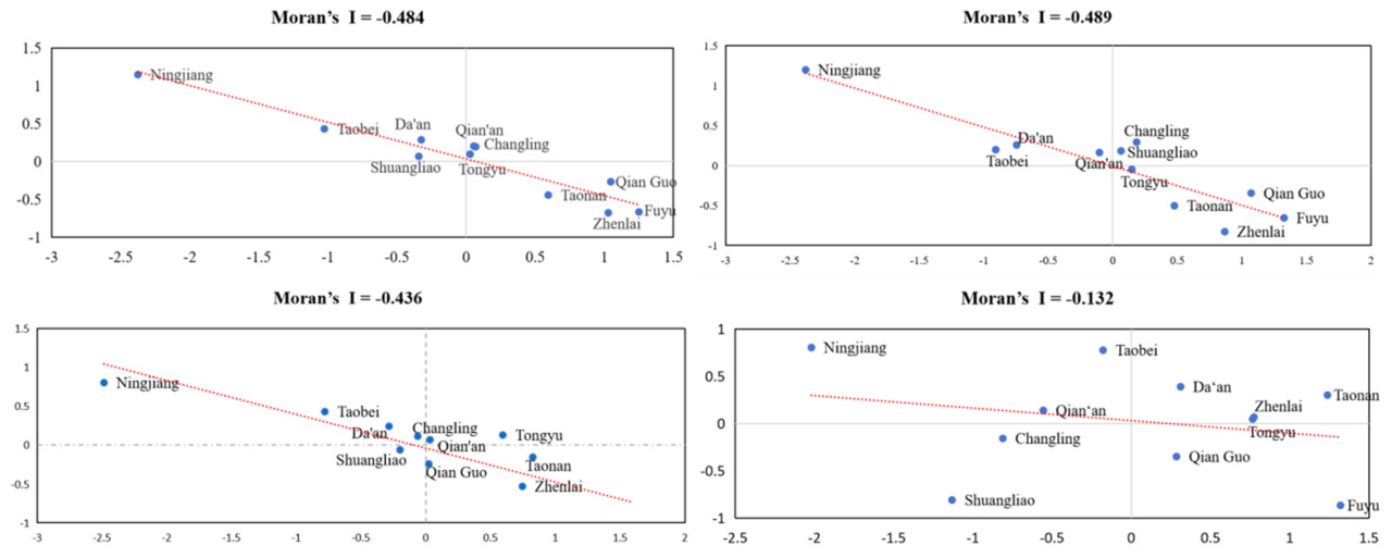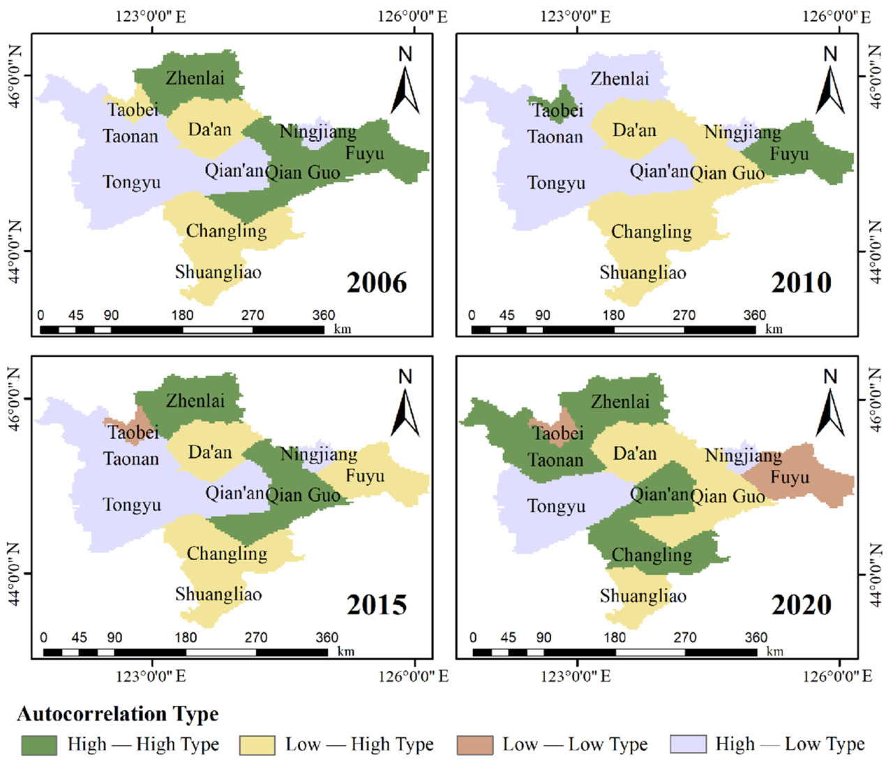 Напротив, в первом и третьем квадрантах было обнаружено ограниченное количество точек, которые обозначают области с «высоким» уровнем координации связей, окруженные другими областями «высокого» уровня, и области с «низким» уровнем координации связей, окруженные другими областями «низкого» уровня, соответственно. Это указывает на положительную корреляцию в координации связей этих областей. Примечательно, что с 2006 по 2020 год индекс Морана в исследуемой области демонстрировал тенденцию к росту, что свидетельствует об усилении пространственной автокорреляции ПЗС WLR за последние 15 лет.Используя программное обеспечение ArcGIS (10.8.1), был проведен локальный пространственный автокорреляционный анализ для оценки ПЗС WLR в WJP. Анализ показал, что области координации сцепления высокого–высокого уровня и области координации сцепления низкого–низкого уровня демонстрируют положительную пространственную корреляцию, в то время как области координации сцепления высокого–низкого уровня и области координации сцепления низкого–высокого уровня демонстрируют отрицательную пространственную корреляцию. Как показано нарисунке 7, в 2006 году уезд Чжэньлай, уезд Цяньго и город Фуюй были определены как кластеры координации сцепления высокого–высокого уровня, тогда как район Таобэй, город Даань, уезд Чанлин и город Шуанляо были отнесены к кластерам координации сцепления низкого–высокого уровня. Кроме того, город Таонань, уезд Тунъюй, уезд Цяньань и район Нинцзян были классифицированы как кластеры координации сцепления высокого–низкого уровня. В 2010 году город Фуюй и район Таобэй были обозначены как кластеры координации с высоким-высоким уровнем сопряжения, в то время как город Даань, уезд Цяньго, уезд Чанлин и город Шуанляо были отмечены как кластеры координации с низким-высоким уровнем сопряжения. Уезд Чжэньлай, город Таонань, уезд Тунъюй, уезд Цяньань и район Нинцзян были определены как кластеры координации с высоким-низким уровнем сопряжения. В 2015 году уезд Чжэлай и уезд Цяньго по-прежнему признавались кластерами координации с высоким-высоким уровнем сопряжения, в то время как город Даань, город Фуюй, уезд Чанлин и город Шуанляо были классифицированы как кластеры координации с низким-высоким уровнем сопряжения. В частности, район Таобэй был обозначен как кластер координации с низким-низким уровнем сопряжения, а город Таонань, уезд Тунъюй, уезд Цяньань и район Нинцзян были классифицированы как кластеры координации с высоким-низким уровнем сопряжения. В 2020 году уезд Чжэньлай, город Таонань, уезд Цяньань и уезд Чанлин были отнесены к кластерам с высоким уровнем координационного взаимодействия. Город Даань, уезд Цяньго и город Шуанляо, напротив, были отнесены к кластерам с низким уровнем координационного взаимодействия. Город Фуюй и район Таобэй были отнесены к кластерам с низким уровнем координационного взаимодействия, а уезд Тунюй и район Нинцзян – к кластерам с высоким уровнем координационного взаимодействия.