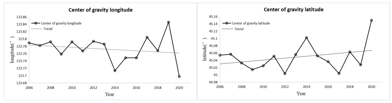 Межгодовой ход координат долготы и широты центра тяжести ПЗС в исследуемом районе показывает, что широта в целом имела тенденцию к увеличению, а долгота – к уменьшению. Следовательно, координаты центра тяжести постепенно смещались к северо-западу. Средняя широта центра тяжести составила 45,0483204° с.ш., с максимальным значением 45,1497° с.ш. в 2020 году и минимальным 45,003176° с.ш. Средняя долгота центра тяжести составила 123,7722819° в.д., с максимальным значением 123,84556° в.д. в 2020 году и минимальным значением 123,697472° в.д. Эти данные указывают на существенное изменение положения центра тяжести ПЗС в 2020 году по сравнению с 2019 годом.