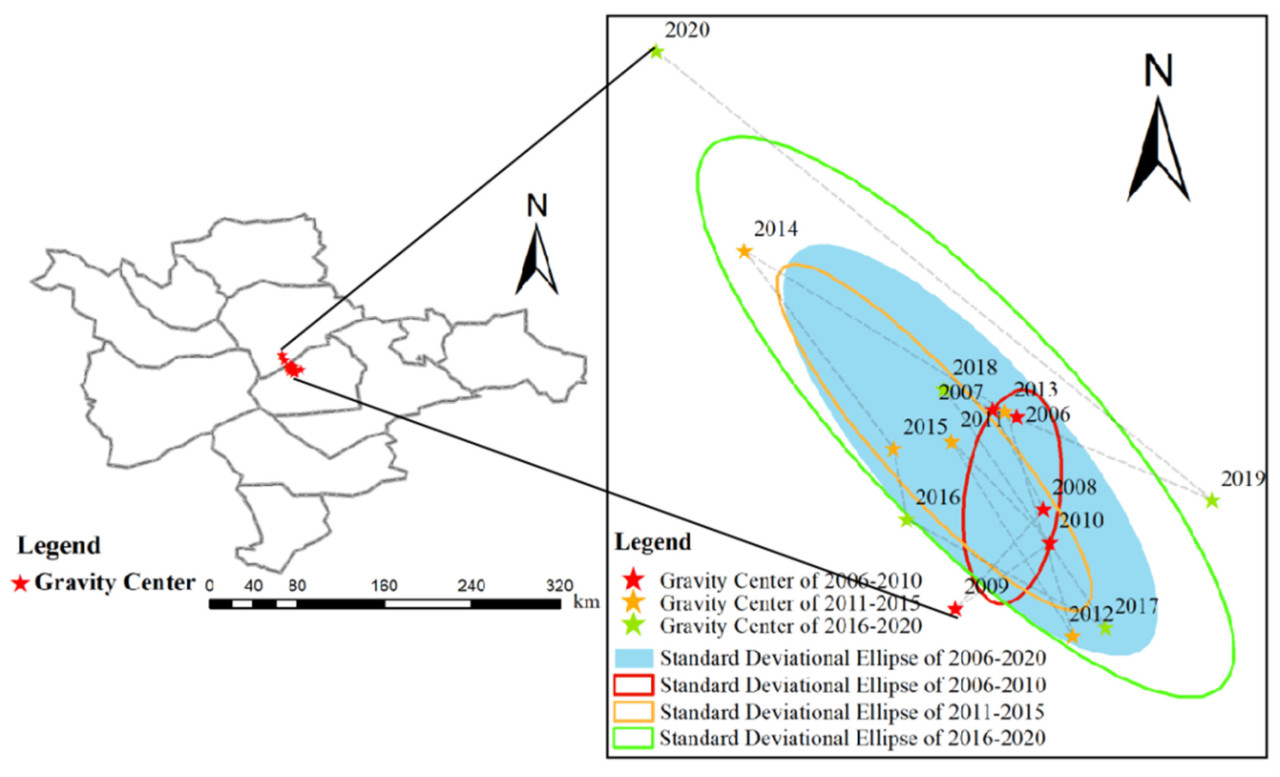 Перенос центра тяжести может пространственно отражать временные и пространственные характеристики эволюции ПЗС в пределах исследуемой области [53]. Используя модель миграции центра тяжести и формулу для расчета эллипса стандартного отклонения, ПЗС каждого района и округа в WJP с 2006 по 2020 год использовались в качестве весов для определения координат долготы и широты центра тяжести для каждой ПЗС исследуемой области в течение этого периода. Впоследствии была создана карта межгодовых изменений, изображающая координаты долготы и широты центра тяжести для ПЗС (Рисунок 8). Кроме того, карта, созданная ArcGIS, использовалась для иллюстрации местоположения центра тяжести ПЗС в WJP и траектории его движения (Рисунок 9).