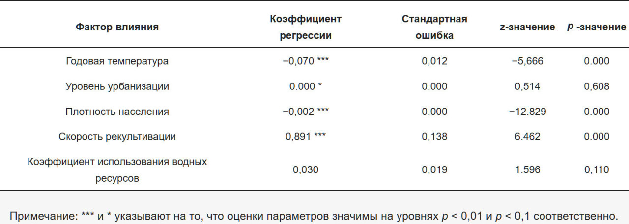 В качестве факторов влияния были выбраны пять показателей: среднегодовая температура (AAT), уровень урбанизации (UR), плотность населения (PD), уровень мелиорации (RR) и уровень использования водных ресурсов (WRUR). Была построена тобит-модель для выяснения движущих механизмов эволюции степени координации связи (CCD) WLR в WJP. Результаты показывают следующее: (1) С временной точки зрения степень координации сопряжения WLR в WJP показала ежегодный рост с 2006 по 2020 год, перейдя от умеренного дисбаланса к промежуточной координации, что отражает тенденцию к постоянному улучшению. (2) Что касается пространственного распределения, общий центр тяжести координации сопряжения водных и земельных ресурсов оставался относительно стабильным в период с 2006 по 2020 год; однако направление распределения постепенно смещалось с северо-востока на юго-запад, а затем с северо-запада на юго-восток. (3) AAT, PD и RR с 2006 по 2020 год были статистически значимыми приp< 0,01. Примечательно, что RR положительно влияет на CCD WLR, тогда как AAT и PD оказывают отрицательное влияние. Напротив, UR и WRUR не оказывают значительного влияния на CCD WLR.