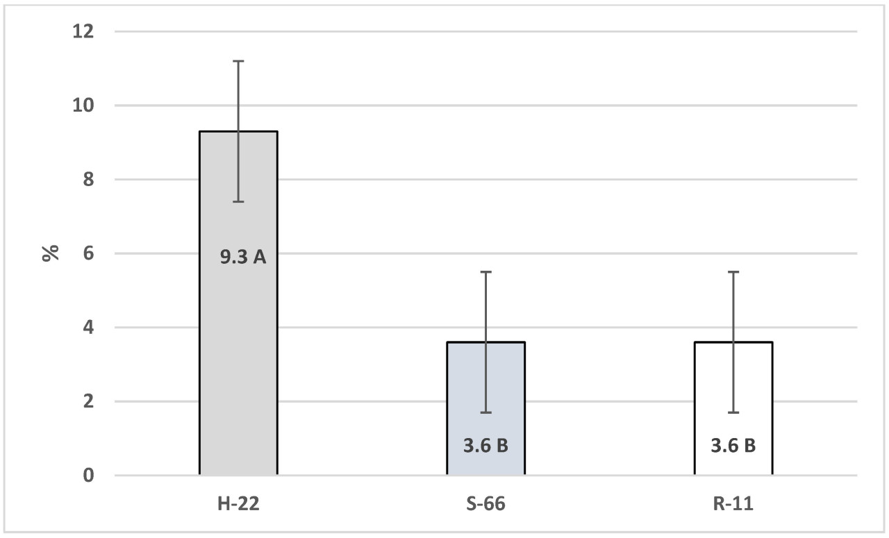 Все случаи гибели кур были зарегистрированы у кур старше 20 недель. Ветеринарный врач птицефермы провел вскрытие павших птиц для диагностики. Однако, помимо очевидных проявлений агрессии и выщипывания перьев, других причин гибели выявлено не было, поэтому все случаи падения кур были классифицированы как результат агрессии и выщипывания перьев. У птиц H-22 наблюдалась самая высокая смертность (p< 0,01) в период выращивания по сравнению с S-66 и R-11 (рисунок 1).