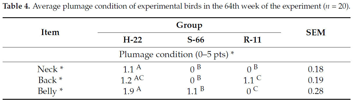 Куры H-22 также характеризовались худшим оперением отдельных частей тела, чем куры S-66 и R-11 приp< 0,01 (таблица 4). Также наблюдалась разница в среднем состоянии оперения всего тела между птицами H-22, S-66 и R-11 приp< 0,05.Таблица 4.Среднее состояние оперения подопытных птиц на 64-й неделе эксперимента (n= 20).