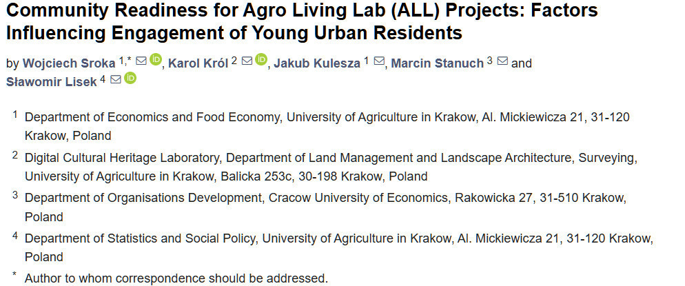 Sroka W, Król K, Kulesza J, Stanuch M, Lisek S. Community Readiness for Agro Living Lab (ALL) Projects: Factors Influencing Engagement of Young Urban Residents. Agriculture. 2025; 15(1):94.