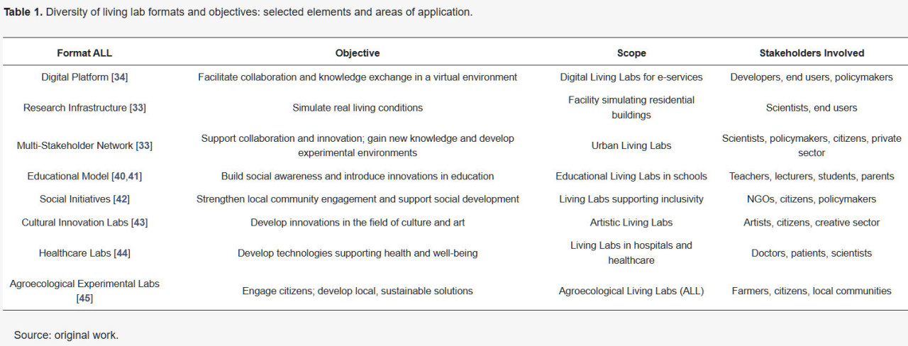 Первоначально живые лаборатории воспринимались как исследовательская инфраструктура, например, здание, имитирующее дом, с удобствами для проживания временных жителей [33]. Со временем они постепенно стали признаваться как динамическая многосторонняя сеть, целью которой является ускорение и управление инновациями, инициированными пользователями, в реальных условиях [33]. В настоящее время живые лаборатории воспринимаются и как сети, и как части сетей. Независимо от их ориентации в сети, они всегда являются временным и пространственным ограничением реальности [34]. Эти инновационные пространства были созданы для совместного производства знаний и экспериментальных сред. Эти среды, будь то физические или виртуальные, создают социальные пространства для проектирования и восприятия будущего всех их обитателей [38]. Таким образом, живые лаборатории являются географически или институционально ограниченными пространствами, где заинтересованные стороны проводят эксперименты для социально-технических инноваций [34]. В таблице 1 представлены избранные примеры и области их применения, иллюстрирующие разнообразие форматов и целей живых лабораторий.