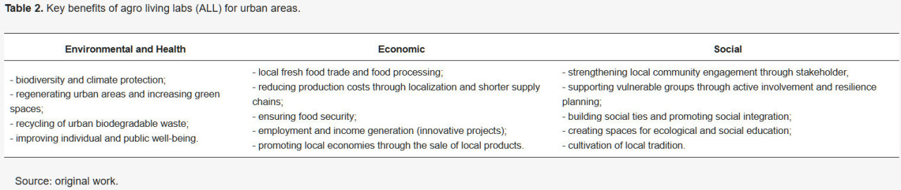 Городские ALL могут играть решающую роль в построении устойчивых городских продовольственных систем, предоставляя выделенное пространство для тестирования решений, адаптированных к потребностям городских сообществ. Агропромышленные лаборатории поддерживают развитие UA, интегрируя местные заинтересованные стороны и стимулируя активное участие сообщества. Это, в свою очередь, увеличивает доступность свежих продуктов питания, снижает зависимость от внешних цепочек поставок и укрепляет продовольственную безопасность. Более того, такой подход способствует устойчивому развитию и восстановлению городских пространств. Он также отвечает растущему спросу на местные здоровые продукты питания в городах, что соответствует целям Европейской стратегии «От фермы до стола» [51].
