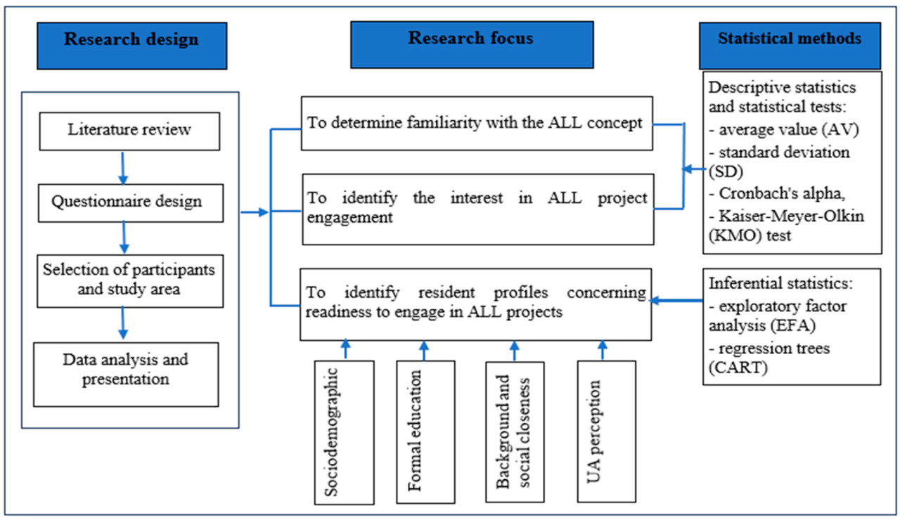 Предыдущий опыт показывает, что концептуализация и реализация проектов ALL является довольно сложной задачей, отчасти из-за того, что ключевая четвертая спираль, т. е. гражданское общество, представляет собой крайне неоднородную группу субъектов [65]. Успех многих проектов зависит от правильного выбора участников. Поэтому многие исследования вовлечения граждан в гражданские проекты пришли к выводу, что индивидуальные характеристики пользователей имеют решающее значение для участия. К ним относятся определенные социально-демографические характеристики, такие как возраст, пол, доход [57,66,67], тип и уровень образования [62,68]. Социальная и физическая близость, переводящаяся в прочность связей с потенциальными пользователями ALL, является еще одним критическим фактором [69,70]. Восприятие и перспективы, включая принятие гражданских проектов, также имеют решающее значение [11,67,70,71]. Что касается проектов UA, несколько ученых также проанализировали влияние потенциально неблагоприятных внешних эффектов или даже рисков (например, потенциальных рисков для здоровья, связанных с загрязнением пищевых продуктов тяжелыми металлами и другими вредными веществами) на принятие таких проектов [72].