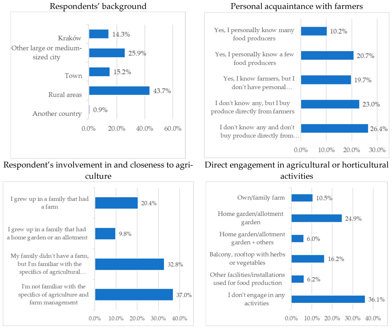 Студенты приехали в основном из городов, в том числе 14,3% из Кракова и 25,9% из других городов (Рисунок 5). Около 43,7% заявили, что выросли в сельской местности. Однако более 90% респондентов заявили, что жили в Кракове во время периода обучения, в то время как остальные ездили на работу и обратно. Структура происхождения респондентов, очевидно, связана с их знакомством с сельскохозяйственным производством и отражает их отношения с сельхозпроизводителями. Более половины респондентов знали фермеров, а 10,2% указали, что знают более одного. Кроме того, выборка продемонстрировала относительно прочные связи и отношения с сельским хозяйством и садоводством.