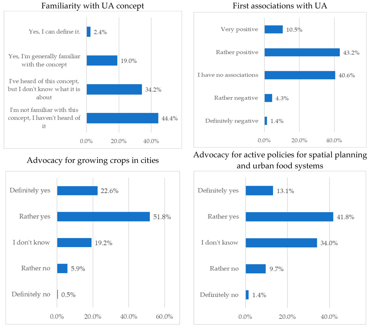 Несмотря на относительно низкий уровень знакомства с концепцией городского сельского хозяйства, более 70% респондентов высказались в поддержку развития сельского хозяйства в городах, а почти 55% поддержали активную политику пространственного планирования и развития городских продовольственных систем. Лишь небольшая группа студентов выступила против инициатив всеобщего доступа к сельскому хозяйству (UA).