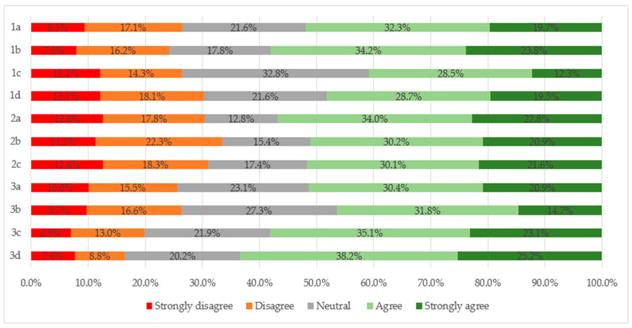 В среднем чуть более 10% респондентов отклонили предложение, но более 20% были очень заинтересованы в активном участии в проектах. Однако их интересы различались в зависимости от проекта. Респонденты заявили о наибольшей готовности участвовать в проектах «умного города». Эти городские инициативы используют новые технологии для повышения эффективности городского управления, качества жизни и устойчивого развития. В данном случае проекты касались защиты климата, смягчения эффекта городского острова тепла (3a), охраны водных ресурсов и поддержки биоразнообразия (3c). Оба проекта получили 60% ответов «полностью согласен» или «согласен». Другая относительно популярная группа включала проекты, связанные с разработкой новых продуктов питания и экспериментированием с новыми вкусами (почти 57% утвердительных ответов в целом). Проекты, направленные на продвижение активного образа жизни среди социально изолированных лиц (1c) и предоставление услуг людям с ограниченными возможностями, таких как садоводческая терапия или иппотерапия, выбирались гораздо реже (1d). Обратите внимание, что относительно небольшая группа заявила о нейтральном отношении, что может свидетельствовать о высокой степени осведомленности и серьезном рассмотрении ответов с их стороны.