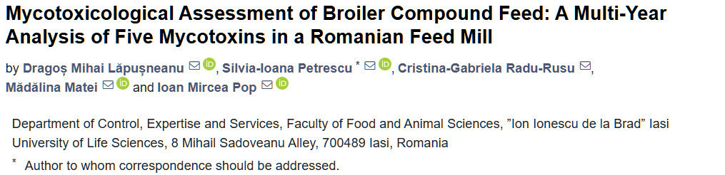 Lăpușneanu DM, Petrescu S-I, Radu-Rusu C-G, Matei M, Pop IM. Mycotoxicological Assessment of Broiler Compound Feed: A Multi-Year Analysis of Five Mycotoxins in a Romanian Feed Mill. Agriculture. 2025; 15(1):84.