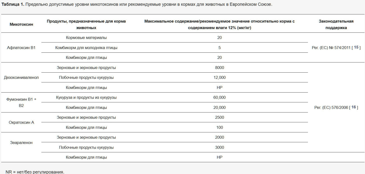 Хотя существуют сотни микотоксинов, нормативные пределы или рекомендации по максимально допустимым уровням в пищевых продуктах и кормах были установлены лишь для небольшого их числа [ 52 ]. Признание того, что микотоксины влияют на здоровье и продуктивность домашней птицы и свиней, привело к введению правил, устанавливающих максимально допустимые уровни для афлатоксинов, и руководящих рекомендаций (рекомендуемых уровней переносимости) для охратоксинов и небольшого числа фузариотоксинов. Пределы различаются не только в зависимости от типа микотоксина, вида животного, предполагаемого использования, кормовых материалов и кормов, но также в зависимости от регулирующей организации или страны; Европейский союз установил руководящие принципы для кормовых материалов и кормов с различиями в зависимости от возраста животного и стадии производства [ 53 ].