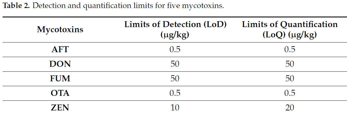 Количественное определение микотоксинов проводилось в соответствии с аналитическим методом, описанным в технических руководствах по иммуноферментному анализу RIDASCREEN® FAST , предоставленных компанией R-Biopharm AG, Дармштадт, Германия. Уровни контаминации АФТ представляют собой сумму АФБ 1 , АФБ 2 , АФГ 1 и АФГ 2 , а ДОН и ФУМ – сумму ФБ 1 и ФБ 2 , а ОТА и ЗЕН в образцах измерялись с помощью отдельных лабораторных наборов RIDASCREEN® FAST .