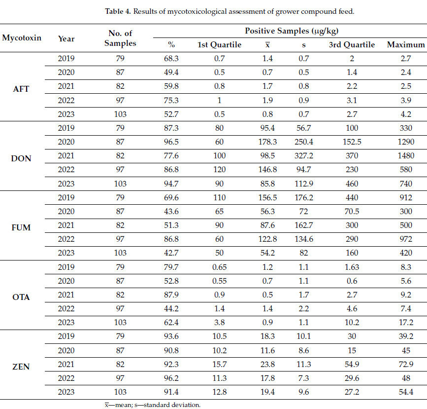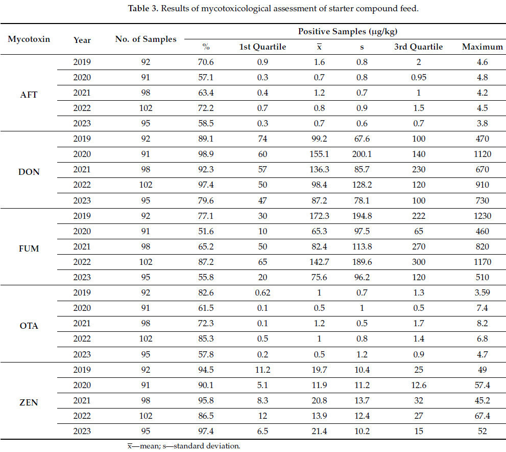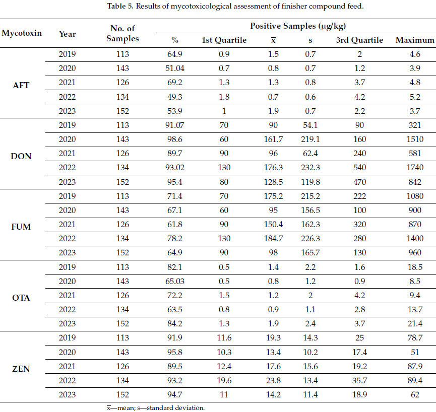 Исследования по оценке загрязнения микотоксинами комбикормов для цыплят-бройлеров в Румынии ограничены, и высокая частота загрязнения, наблюдаемая в данном исследовании, подчеркивает важность улучшения контроля микотоксинов по всей стране. В период с 2019 по 2023 год, когда были отобраны проанализированные образцы на заводе по производству комбикормов в Румынии, уровни загрязнения образцов были ниже максимально допустимых норм Европейского союза; однако мы считаем необходимым установить и применять биологически значимые нормативные пороговые значения и пределы, которые могли бы обеспечить здоровье птицы. Кроме того, было показано, что распределение и наличие микотоксинов варьировались от года к году в связи с изменением климатических условий.