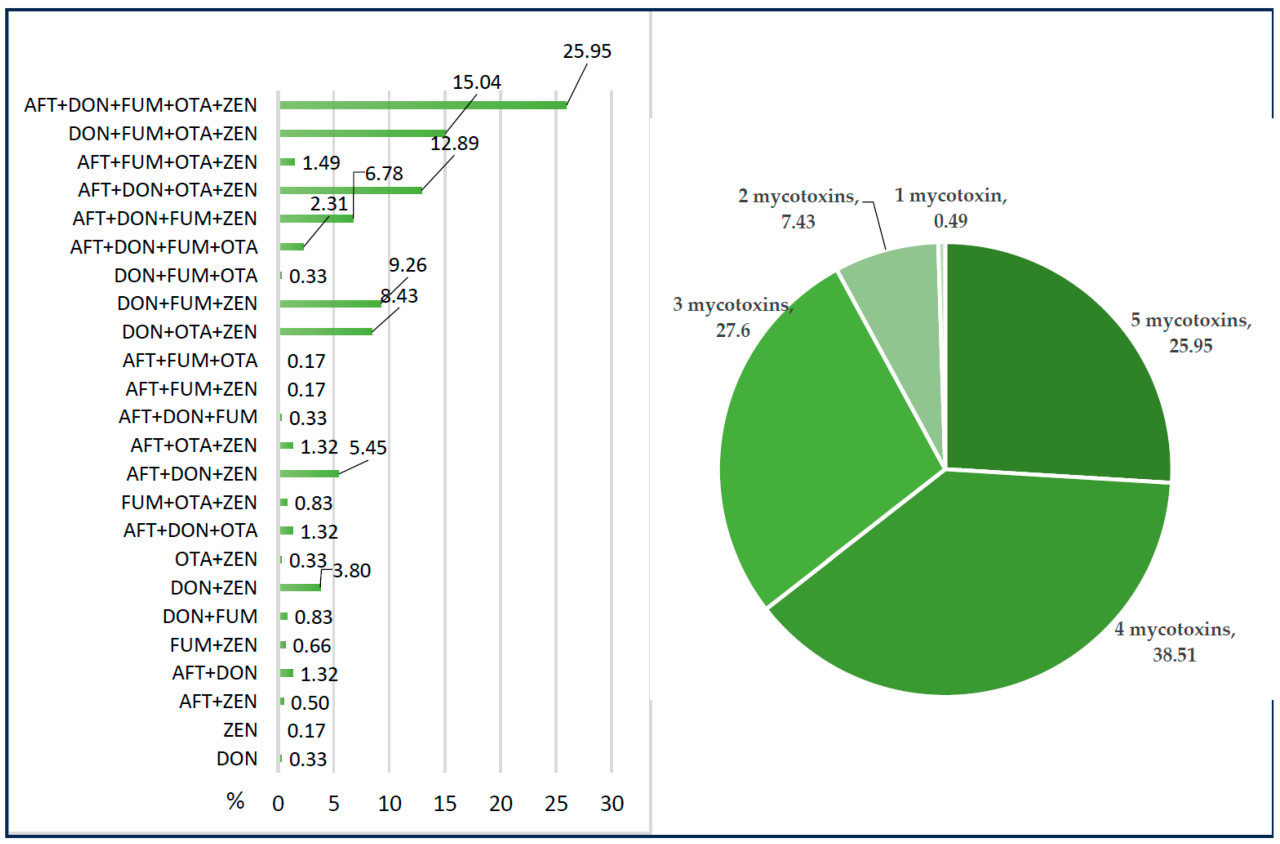 Кроме того, в случае изученных образцов комбикормов, как мы отметили на рисунке 1 , в большинстве случаев (38,51%) мы выявили сопутствующее присутствие четырёх микотоксинов. Грубер Домингер и др. [ 75 ] объясняют, что, по сути, сценарий совместного присутствия микотоксинов в корме является наиболее правдоподобным.
