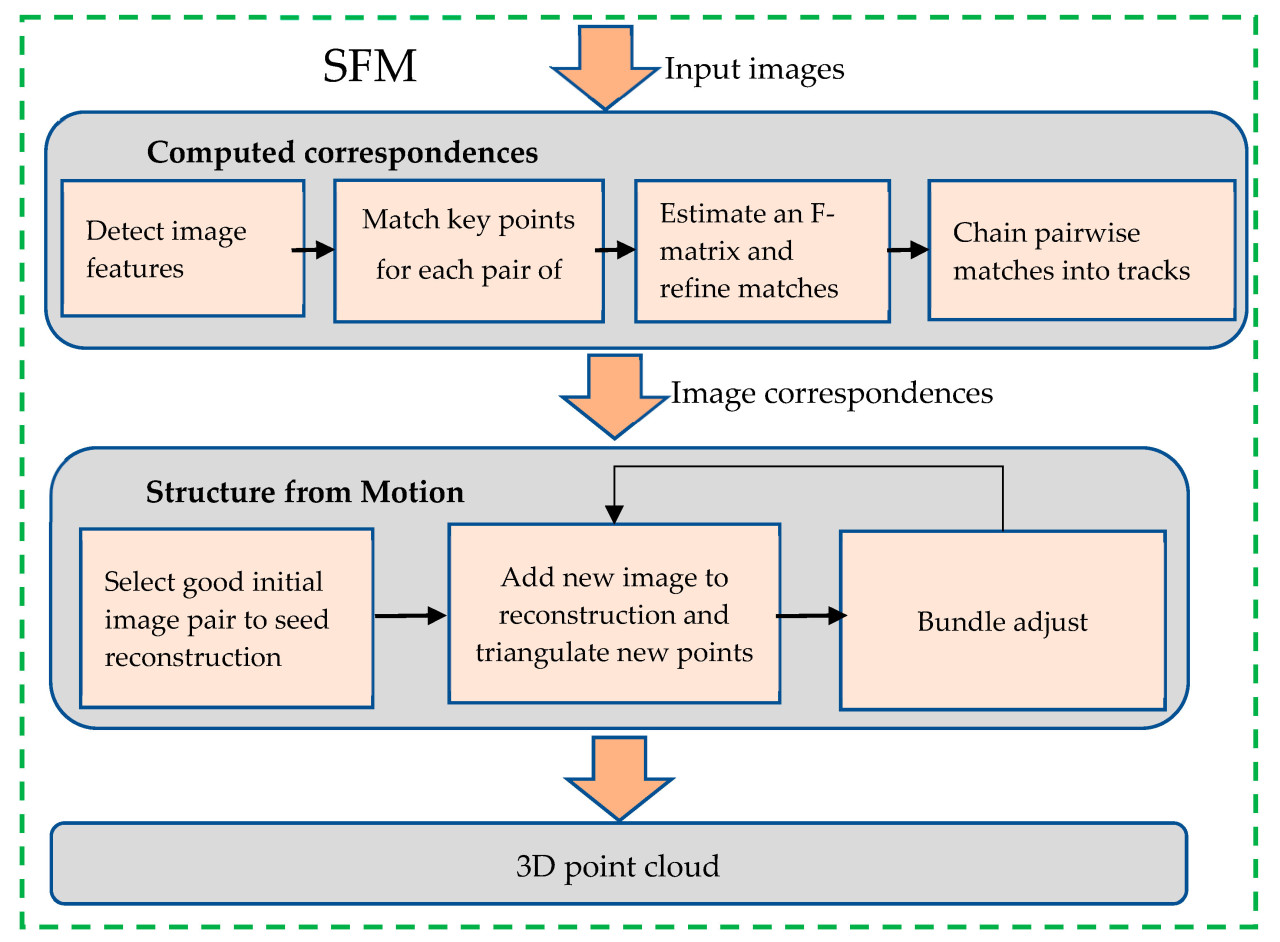 После получения изображения необходимо провести трёхмерную реконструкцию облака точек с помощью алгоритма SFM (структура из движения). Как показано на рисунке 2. Процесс использования алгоритма SFM для создания трёхмерного облака точек метёлки кукурузы выглядит следующим образом. Сначала алгоритм SFM извлекает информацию о фокусном расстоянии из входных изображений. Затем для извлечения признаков изображения применяются алгоритмы извлечения признаков, такие как SIFT. Затем модель kd-tree используется для вычисления евклидова расстояния между характерными точками двух изображений для выполнения сопоставления характерных точек с целью определения пар изображений с необходимым количеством совпадений характерных точек.