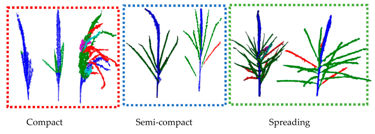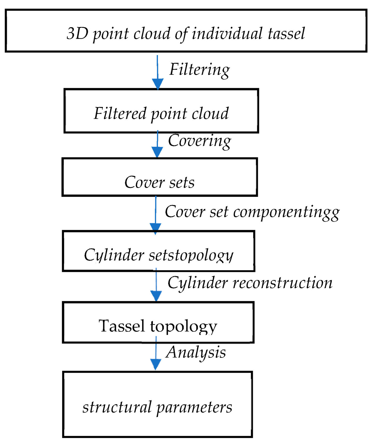 В настоящее время для извлечения фенотипов сельскохозяйственных культур используется большое количество методов, основанных на изображениях и облаках точек, например, использование изображений для извлечения трехмерной структуры проростков кукурузы [ 12 ] и извлечения площади листьев и высоты растения кукурузы [ 13 , 14 , 15 ], а также извлечения количества ветвей, длины ветвей и угла метелки [ 16 , 17 ], и для этой цели также были разработаны системы [ 18 , 19 , 20 ]. Однако для анализа трехмерных структурных параметров двумерные изображения не могут преодолеть проблему окклюзии. Трехмерные данные облаков точек предлагают значительные преимущества при извлечении нескольких структурных параметров целевого объекта [ 21 , 22 , 23 ]. В настоящее время большинство данных облаков точек генерируются с помощью трехмерных сканирующих устройств, таких как LiDAR (2D/3D), TOF-камеры (камеры времени пролета) и сканеры структурированного света. Наземное лазерное сканирование (TLS) может точно характеризовать 3D-структуру деревьев с точностью до миллиметра [ 24 , 25 ]. Лей и Суреш и др. [ 26 ] использовали данные наземного LiDAR для извлечения 3D-структурной информации о растениях кукурузы, включая площадь листьев и угол наклона листьев. Паулус и др. [ 27 ] изучали получение и реконструкцию 3D-облака точек ячменя с использованием LiDAR с измерительным рычагом для извлечения площади листьев и высоты растений. Чайвиватракул и др. [ 28 ] использовали камеру TOF для получения данных об облаке точек проростков кукурузы для реконструкции 3D-модели проростков кукурузы, извлекая такую информацию, как максимальный/минимальный диаметр стебля, высота стебля, площадь листьев, длина листьев и угол наклона листьев. Однако этим методам часто не хватает плотности облака точек или геометрической точности при изучении объектов в масштабе органа, таких как метелка кукурузы. Донг и Шэн и др. [ 4 , 29 ] построили трёхмерное облако точек метёлки кукурузы, используя изображения и извлечённые показатели, такие как высота растения, площадь листа, длина главного колоса и количество ветвей. Однако существуют проблемы, связанные с низкой автоматизацией, высокой стоимостью и низкой эффективностью анализа. Сюй и др. [ 30] сделали значительный шаг вперед. Они разработали систему, известную как TIPS (система трехмерного фенотипирования изображений). Эта система использует алгоритм TreeQSM. С помощью этого алгоритма она реконструирует и анализирует топологию отдельного дерева. Таким образом, ей удается извлечь фенотипические параметры структуры метелки кукурузы, имеющие сходство со структурой дерева. Этот процесс извлечения предлагает несколько решений. Он решает проблему автоматического получения изображений метелки кукурузы. Он также решает проблемы, связанные с созданием трехмерного облака точек и реконструкцией топологии метелки. Более того, система дополнительно оценивает некоторые аспекты. Она изучает пространственную изменчивость облака точек. Она также оценивает извлеченные длины осевых веретен метелки. Кроме того, она анализирует количество ветвей, общую длину ветвей и углы наклона ветвей. Оценка приводит к выводу. Результаты показывают, что система эффективна и точна. С другой стороны, система выполняет определенную задачу. Это решает проблему инструмента для извлечения фенотипических параметров м