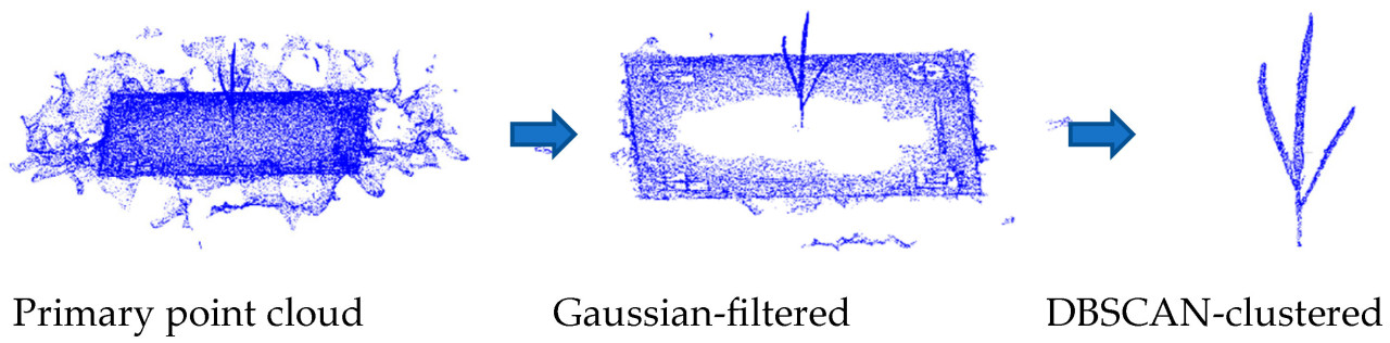 Процесс гауссовой фильтрации выполняется непосредственно в MATLAB 2017b с помощью функции pcdenoise (noisyData, «NumComponents», numComponents), где numComponents равен 0,1. После фильтрации используется функция кластеризации DBSCAN (eps = 0,5, min_samples = 150) для извлечения облака точек отдельных кисточек. Процесс показан на рисунке 5 .
