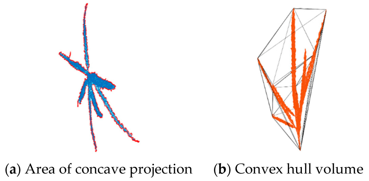 Предыдущие исследования показали, что пространственная изменчивость вдоль осей x, y и z точечных облаков топологии метелки кукурузы, реконструированных с использованием алгоритма TreeQSM и изображений, полученных с помощью этой системы, является стабильной, что демонстрирует высокую точность исходных точечных облаков. Кроме того, коэффициент корреляции между предсказанными и измеренными значениями нескольких фенотипических параметров имеет средний абсолютный коэффициент R2 > 0,9 [ 30 ]. При получении длины главного колоса необходимо удалить длину стебля. TreeQSM может записывать координаты самой низкой точки во время реконструкции топологической структуры (обычно координаты самой низкой точки стебля) и координаты первой ветви, а также категорию, длину и радиус всех сегментов подгонки цилиндра. Вычтите координаты самой низкой точки из координат первой ветви, чтобы получить длину стебля, а затем получите длину главного колоса. Для диаметра главного колоса и диаметра стебля это среднее значение всех подобранных диаметров цилиндров на главном колосе и стебле. В этом исследовании использовалась версия TreeQSM 2.4.1. TreeQSM имеет пять входных параметров: PatchDiam1, PatchDiam2Min, PatchDiam2Max, BallRad1 и BallRad2. В этом исследовании PatchDiam1, PatchDiam2Min и PatchDiam2Max были скорректированы для получения трехмерной топологической структуры метелок кукурузы и извлечения связанных фенотипических параметров [ 51 ]. Подробные правила корректировки параметров можно найти в справочных документах [ 52 ]. Результаты пространственного масштаба облака точек, извлеченные с помощью алгоритма TreeQSM, являются нефизическими величинами и требуют коррекции масштаба, чтобы гарантировать, что извлеченные результаты параметров фенотипа являются физическими величинами со стандартными единицами квантования. Как показано в Таблице 2 , метод выпуклой оболочки был использован для извлечения площади вогнутой короны ( Рисунок 6, а) и объёма выпуклой оболочки ( Рисунок 6, б) кисточки на плоскости проекции XOY. Площадь и объём короны были получены непосредственно с помощью граничной функции в MATLAB (версия 2017b), при этом третий параметр, представляющий степень рыхлости, был установлен равным 1.