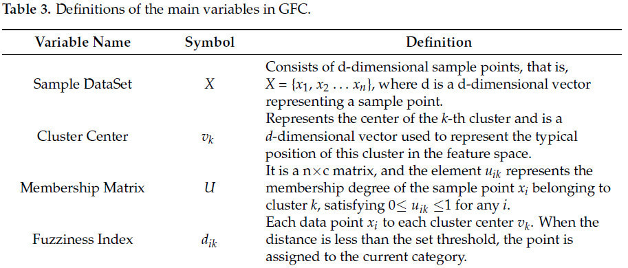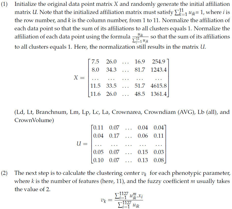 В этом исследовании модель GFC используется для проведения кластерного анализа параметров фенотипа метелки кукурузы. GFC — это вероятностная модель, которая широко применяется в различных областях, таких как распознавание образов, компьютерное зрение, машинное обучение, интеллектуальный анализ данных и биоинформатика [ 53 , 54 , 55 ]. GFC объединяет концепции GFC. GFC позволяет точкам данных принадлежать нескольким кластерам с различной степенью принадлежности, а не быть жестко назначенными одному кластеру. GFC использует гауссовы функции для определения функции принадлежности, что приводит к нечеткому членству. Конкретно для этого исследования процесс кластеризации и ключевые переменные приведены ниже и в Таблице 3 :
