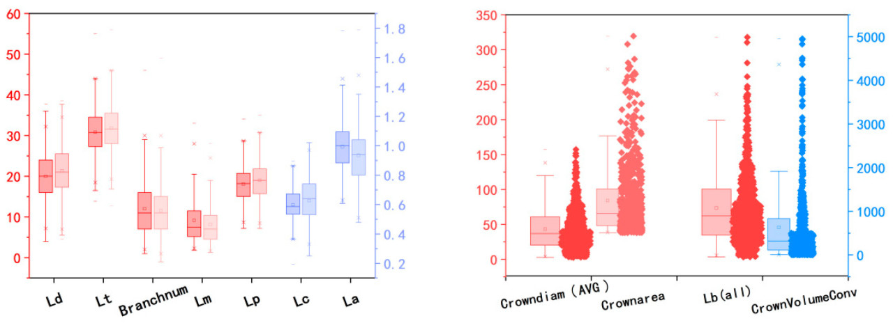 В этом исследовании анализировалось распределение данных по 11 извлеченным параметрам, как показано на рисунке 8. Все фенотипические параметры, за исключением количества ветвей, измеряются в сантиметрах. Левая сторона каждого набора сравнительных данных на рисунке 6 а представляет собой измеренное значение, а правая сторона - извлеченное модельное значение. Четыре левых набора данных соответствуют меткам шкалы слева, в то время как два правых набора данных соответствуют меткам шкалы справа. Из рисунка 6 очевидно, что медианное, среднее, минимальное и максимальное значения длины стебля и длины главного колоса больше измеренных. Это в первую очередь потому, что модель TreeQSM обеспечивает более подробные расчеты длины, тогда как измеренные данные, хотя и выпрямлены, не могут быть полностью выпрямлены, чтобы избежать поломки метелки. Кроме того, максимальный диаметр кроны, высота кроны, диаметр стебля и диаметр главного колоса показывают значительные расхождения между измеренными и извлеченными значениями. Это в основном из-за сложности точного измерения максимального диаметра кроны и высоты кроны и меньших значений диаметров ствола и главного колоса, которые подвержены большим ошибкам измерения. Средний диаметр кроны, общая длина ветвей, площадь кроны и объем выпуклой оболочки - все это результаты, извлеченные с помощью TreeQSM. Примечательно, что средний диаметр кроны отображается как десятикратное увеличение его извлеченного значения. Левый вертикальный стержень представляет собой красную шкалу данных ящика с единицами в см для среднего диаметра кроны и общей длины ветвей и см2 для площади кроны. Правый вертикальный стержень, синего цвета, представляет объем выпуклой оболочки с единицами в см3 . Как показано на рисунке 6 , средние значения для этих четырех фенотипических параметров значительно выше медианных значений, что указывает на то, что более 50% значений выборки распределены ниже среднего.