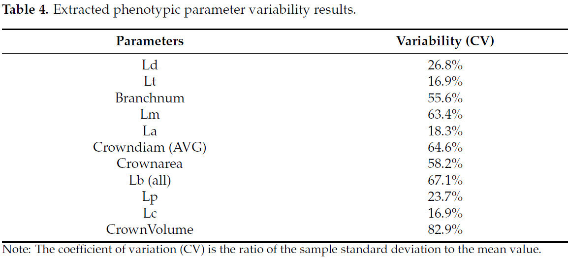 Параметры, извлечённые с помощью модели TreeQSM, всё ещё находятся в пределах евклидова расстояния и требуют коррекции. Процесс коррекции и точность результатов были проверены [ 30 ]. Абсолютный коэффициент вариации P набора данных в данном исследовании составляет от 34 до 39, но более 84% выборок имеют коэффициент вариации от 36 до 38, что говорит об относительно небольшой пространственной изменчивости облаков точек, полученных в тех же условиях.