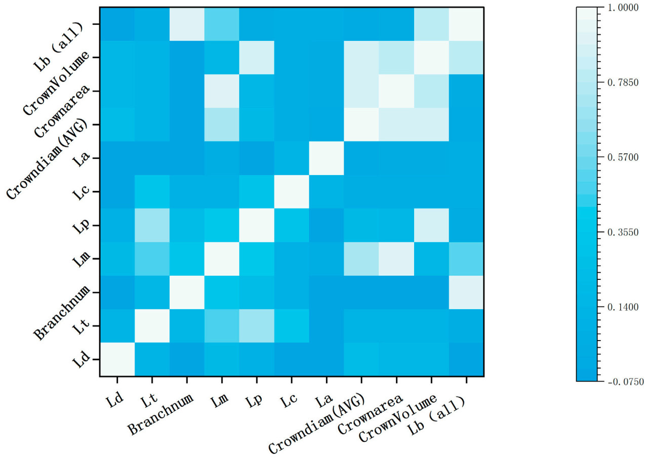 Используя метод коэффициента корреляции Пирсона, были построены корреляции между 11 фенотипическими параметрами метелок кукурузы, извлеченными с помощью TreeQSM. Как показано на рисунке 9 , наиболее высокая корреляция была обнаружена между количеством ветвей метелки и общей длиной ветвей, а также между площадью коронки и объёмом выпуклой оболочки, оба показателя превышали 0,9. Средний диаметр коронки показал следующую по величине корреляцию с площадью коронки и объёмом выпуклой оболочки, оба показателя превышали 0,8. Напротив, корреляции между диаметром главного колоса, диаметром стебля и длиной стебля были относительно ниже.