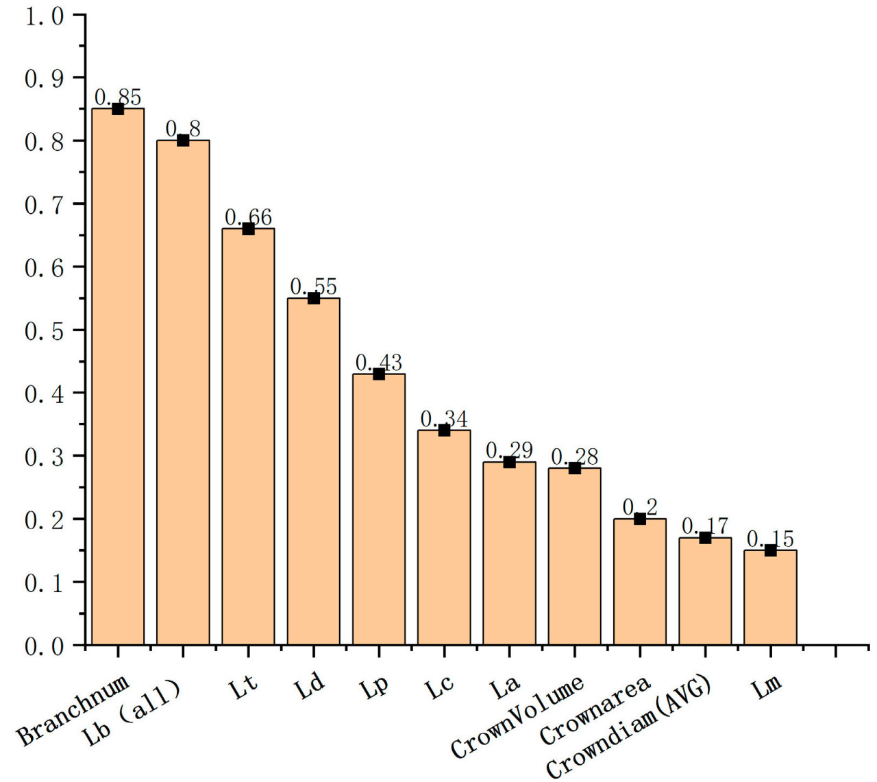 В данном исследовании для анализа важности извлеченных параметров фенотипа метелки кукурузы использовался алгоритм случайного леса, который сравнивал их с результатами классификации GFC и проверял корректность результатов. С помощью модели случайного леса была проведена ранжировка важности 11 извлеченных параметров фенотипа метелки. При фиксированном случайном числе 42 70% данных были случайным образом отобраны в качестве обучающей выборки, а 30% — в качестве проверочной.