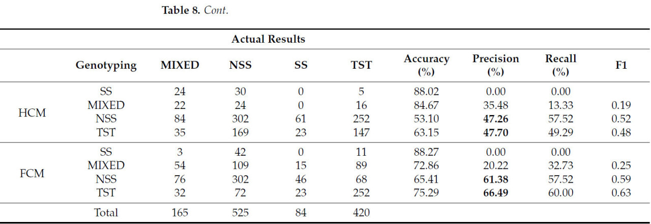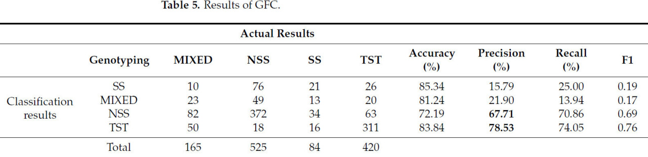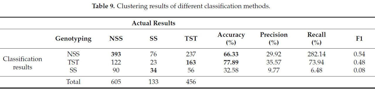 В разделе предыдущих результатов это исследование кластеризовало данные по четырем типам. Однако тип «смешанный» не принадлежит к определенному генетическому типу материалов кукурузы. Это исследование изучает удаление категории «смешанный». Исходные образцы MIXED были перераспределены по SS, NSS или TST на основе наибольшей вероятности доли. Результаты показаны в Таблице 9. Номера перераспределенных образцов были NSS: 605, SS: 133 и TST: 456. Затем новые образцы были подвергнуты GFC с использованием 10 параметров. Точность классификации NSS составила 55,7% в первом результате кластеризации, точность генотипа TST составила 52,9% во втором результате кластеризации, а точность SS составила 18,9% в третьем результате кластеризации. По сравнению с классификацией по четырем категориям точность значительно снизилась.