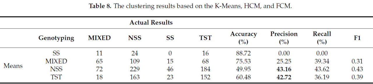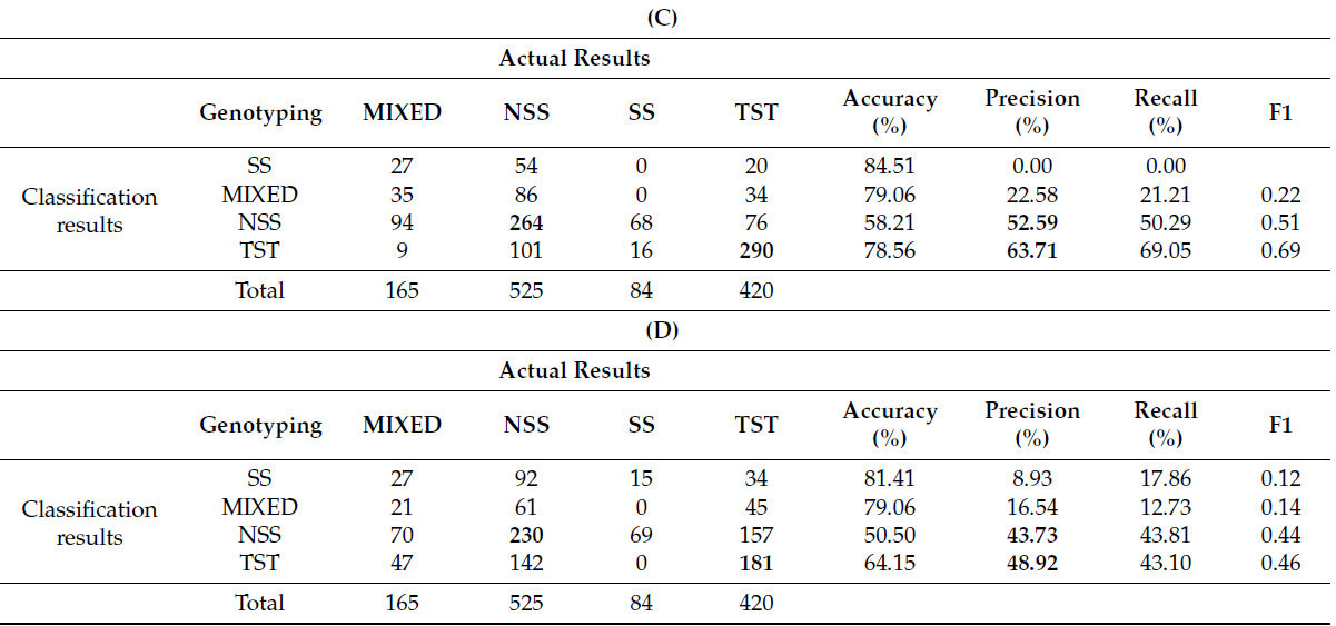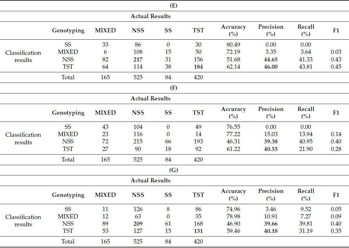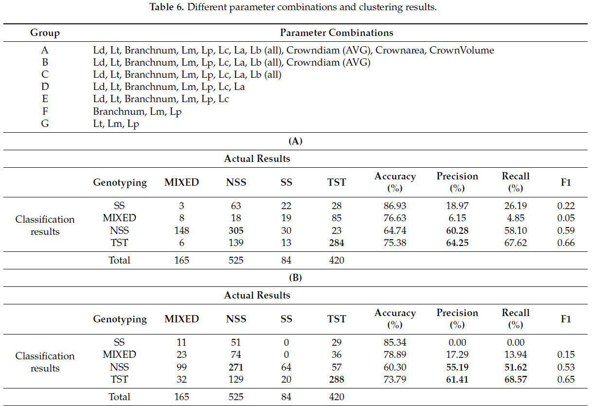 Результаты кластеризации различных параметров ( таблица 6 ) показывают, что точность для категорий SS и MIXED остаётся относительно низкой. Точность кластеризации для генотипов NSS и TST постепенно снижается с уменьшением количества параметров. В частности, наблюдается значительное снижение точности при переходе от комбинаций C к D, что указывает на значительный вклад длины ветви в классификацию генотипа и на большую её изменчивость. С уменьшением количества параметров кластеризации точность продолжает снижаться.
