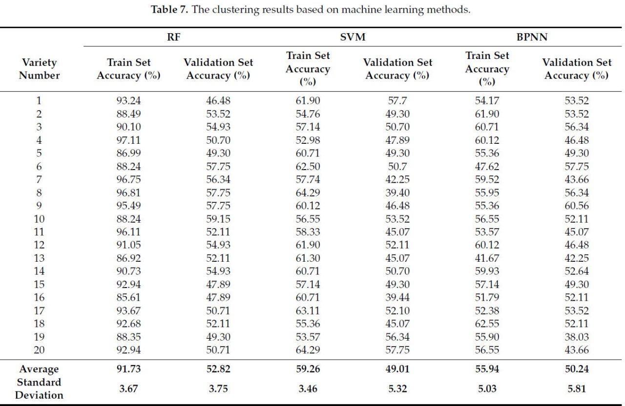 Результаты, полученные с помощью различных методов кластеризации, различаются. В этом исследовании сравнивались эффекты кластеризации трех распространенных методов машинного обучения, а именно: машины опорных векторов (SVM), случайного леса и нейронной сети обратного распространения (BP), а также трех распространенных алгоритмов, а именно: k-средних, иерархической кластеризации (HCM) и нечеткой кластеризации C-средних (FCM). Как было установлено в предыдущем исследовании, использование 10 фенотипических параметров для кластеризации по четырем категориям может обеспечить наивысшую точность. Поэтому в этом исследовании для сравнения результатов использовались те же 10 фенотипических параметров. Данные выборки были случайным образом разделены на 20 групп обучающих и проверочных наборов в соотношении 7:3. Точность кластеризации рассчитывалась на основе доли правильно классифицированных образцов от общего числа. Результаты кластеризации показаны в Таблице 7. При сравнении этих трех алгоритмов машинного обучения случайный лес демонстрирует наивысшую точность как на обучающем, так и на проверочном наборе, но его преимущество невелико. Точность метода составляет от 50% до 60%, а относительно более высокая точность на обучающей выборке также обусловлена явлением переобучения. Судя по результатам, точность всех трёх методов невысока, и различия между ними также незначительны. Это связано с тем, что все три метода являются методами контролируемой классификации и не подходят для решения нелинейной задачи кластеризации фенотипов и генотипов кукурузы.