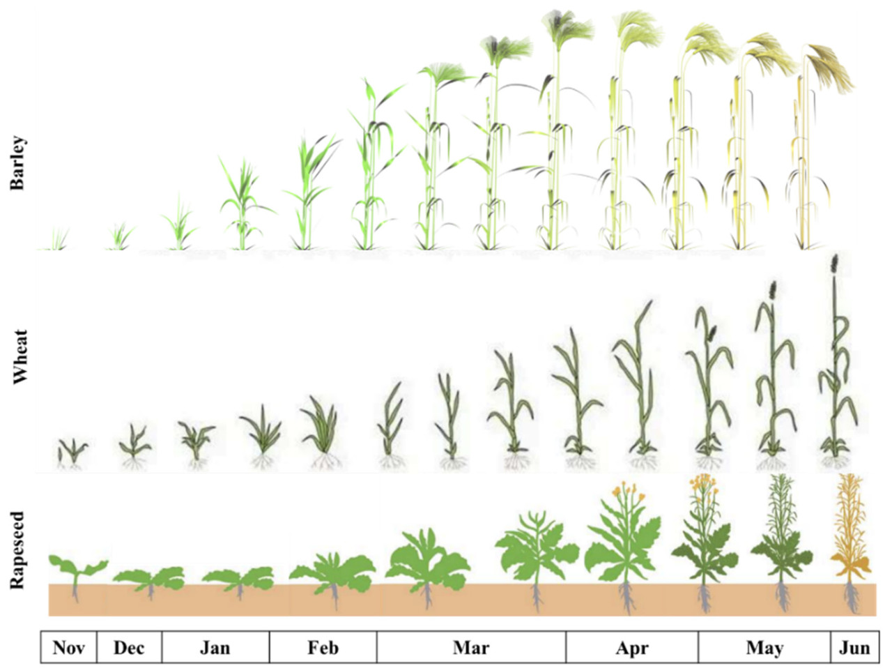 (2) Понимание вегетационных периодов этих трёх видов озимых культур. Первым шагом было получение подходящих спутниковых снимков в период вегетации этих трёх озимых культур, чтобы снизить вероятность ошибочной классификации их как яровых или яровых.