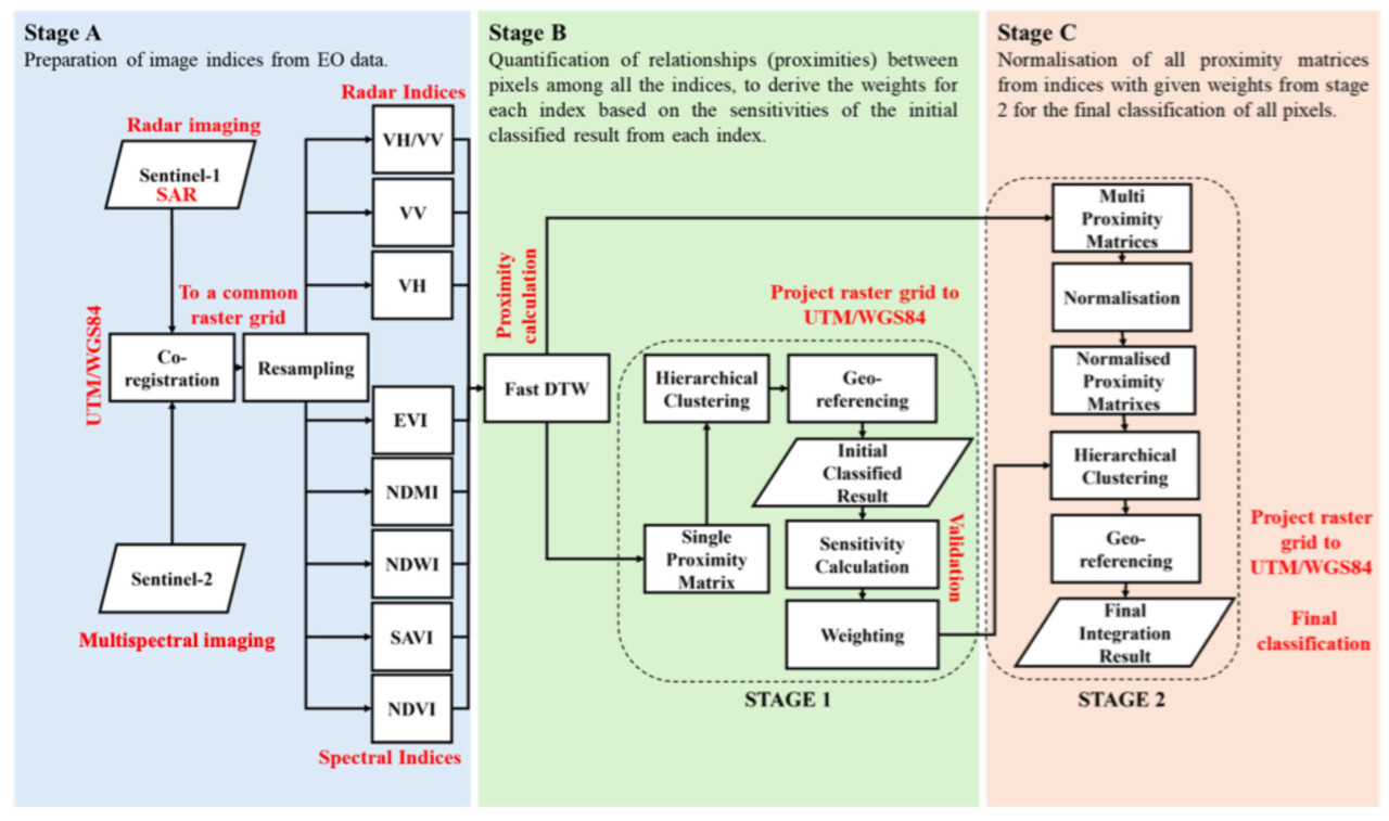 Для этой работы потребовались временные ряды изображений со спутников EO Sentinel-1 и -2, как показано в рабочем процессе. Изображения Sentinel-1 были сопоставлены с изображениями Sentinel-2 с помощью UTM/WGS84, и оба изображения были пересчитаны до одинакового размера пикселя. Значения NDVI, индекса вегетации с поправкой на почву (SAVI), нормализованного разностного водного индекса (NDWI), NDMI, EVI, VH, VV и VH/VV были извлечены из каждого пикселя на этапе A. На этапе B близость между каждым пикселем рассчитывалась с помощью быстрого DTW; таким образом, было сгенерировано восемь матриц близости. Пиксели были классифицированы с помощью HC с помощью восьми матриц близости, и результаты были геопривязаны и сохранены в восьми файлах geoTiff на первом этапе. Восемь файлов geoTiff были проверены на основе данных RPA (Великобритания) для определения чувствительности значений NDVI, SAVI, EVI, NDWI, NDMI, VH, VV и VH/VV. На этапе C чувствительность каждого значения стала его заданным весом для каждой нормализованной матрицы близости. Нормализованные матрицы близости с заданными весами стали окончательными входными данными для моделей HC ML для получения окончательных результатов интеграции на втором этапе ( рисунок 3 ).