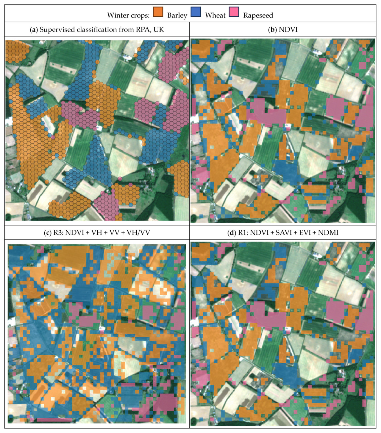 Сравнивая данные наземной проверки на рисунке 2b и контролируемую классификацию RPA на рисунке 8a с неконтролируемыми классификациями R1 и R5, становится ясно, что контролируемая классификация, использующая данные наземной проверки, дала наиболее точные результаты с точностью 84% для ячменя, 76% для пшеницы и 94% для рапса. Общая идентификация озимых культур, а также классификация ячменя и пшеницы были точнее при использовании контролируемого подхода с надежными данными наземной проверки, чем при использовании R1 и R5. Тем не менее, R1 и R5 приблизились к уровню точности, аналогичному уровню точности контролируемой классификации RPA, и продемонстрировали более высокую точность и достоверность классификации озимых культур по сравнению с предыдущими исследованиями без использования данных наземной проверки. Этот неконтролируемый подход сокращает время и трудозатраты, а также демонстрирует, чего можно достичь при отсутствии данных наземной проверки. В некоторых случаях R1 и R5 ошибочно классифицировали некоторые живые изгороди как пшеницу, а также некоторые «зарезервированные» участки на ячменных полях как пшеницу. Некоторые из них могут быть ошибочными классификациями, но сравнение результатов со снимками Sentinel-2, полученными в мае 2020 года, показывает, что некоторые живые изгороди и отведенные участки по краям ячменных полей действительно представляют собой озимую пшеницу. Это указывает на то, что предлагаемый нами метод неконтролируемой классификации может эффективно работать в условиях смешанного земледелия, как в локальном, так и в региональном масштабе. Однако мы считаем, что наилучшим подходом к валидации должен быть визуальный осмотр многоспектральных изображений, а также полевые исследования.