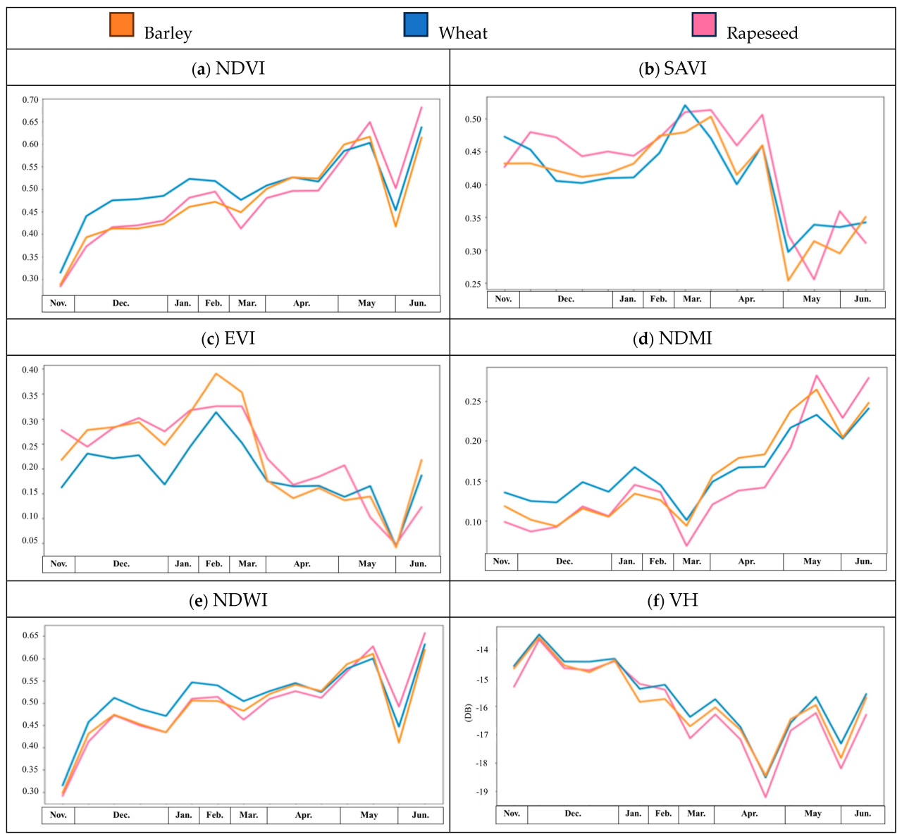 Используя один из самых надежных результатов с многоспектральными и SAR-снимками, R5, мы исследовали закономерности фенологии озимых культур, как показано на рисунке 9 , где месяцы вегетационного периода показаны на осях X участков, оранжевые линии представляют ячмень, синие линии - пшеницу и сиреневые линии - рапс. На рисунке 9 а показаны значения NDVI трех озимых культур в течение вегетационного периода; можно увидеть, что ячмень и пшеница очень похожи, и это иногда приводило к неправильным классификациям. Поскольку закономерность значений NDVI для рапса немного отличалась от таковых для ячменя и пшеницы, только рапс был эффективно распознан при этой неконтролируемой классификации.