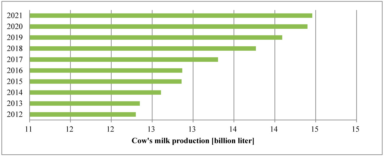 Польша является одним из крупнейших производителей молока в Европейском союзе (ЕС). В 2022 году производство сырого молока на фермах в ЕС оценивалось в 160,0 млн тонн, тогда как в 2023 году производство молока в Польше составило 12,9 млрд литров [47]. Сырьевая база молочной промышленности основана на индивидуальных поставщиках, которые производят более 11 млрд литров молока ежегодно. Производство молока в Польше в период 2012–2021 годов показало восходящую тенденцию. Объем производства коровьего молока в 2018–2021 годах находился на уровне от 13,7 до 14,4 млрд литров (Рисунок A4). Учитывая данные за 2023 год, можно оценить выбросы ПГ от переработки молока, которые в среднем составили 4,73 млрд кг CO2-экв.