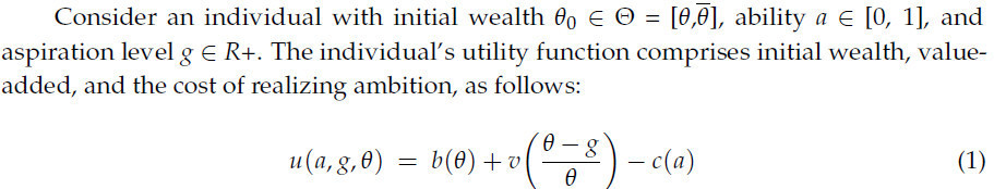 Рассмотрим человека с начальным богатством θ0 ∈ Θ = [θ,θ], способность a ∈ [0, 1] и уровень стремлений g ∈ R +. Функция полезности индивида включает начальное богатство, добавленную стоимость и стоимость реализации амбиций следующим образом: