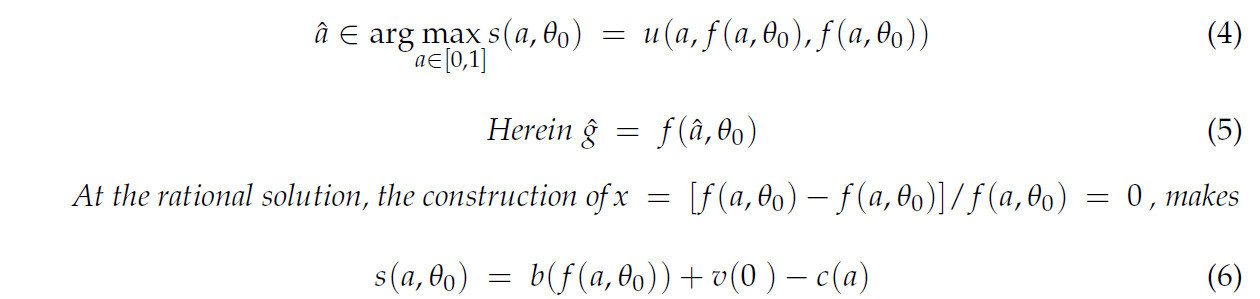 Позволять 𝑎 ( 𝑔 ,𝜃0) представляют собой оптимальный набор возможностей. Поведенческие решения представляют собой согласованные пары «способности–стремления» (𝑎˙,𝑔˙) где 𝑎˙∈ 𝑎 (𝑔˙,𝜃0) и 𝑔˙∈ 𝑓(𝑎˙,𝜃0). Предложение 1 устанавливает, что