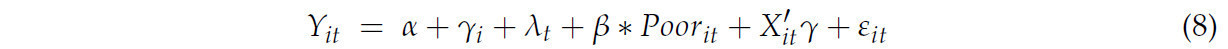 где Y представляет собой основные зависимые переменные (уровень стремлений и уровень возможностей) для индивида i в момент времени t . Бедность — ключевая независимая переменная, измеряющая уровень бедности с использованием различных методов, включая показатели бедности на основе доходов и расходов.𝑋′𝑖 𝑡 включает другие контрольные переменные на индивидуальном, домашнем и региональном уровнях, которые могут влиять на уровни стремлений и возможностей.