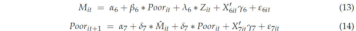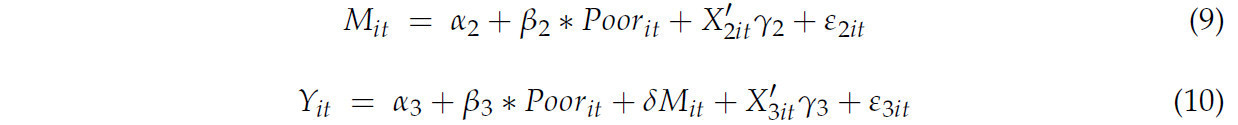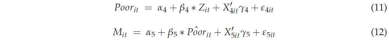Согласно шагам оценки инструментальной переменной 2SLS, уравнение (11) регрессирует независимую переменную Poor it на инструментальную переменную Z it и (12) регрессирует оцененную независимую переменную на переменную-медиатор M it . Аналогично, уравнение (13) сначала регрессирует как независимую переменную Poor it , так и инструментальную переменную Zit на переменную-медиатор M it , а затем использует оцененную переменную-медиатор и независимую переменную Poor it для регрессии зависимой переменной Poor it+ 1 , таким образом оценивая уравнение (14). Здесь, чтобы дополнительно избежать потенциальной проблемы пропущенной переменной, присутствующей в наблюдениях отдельных лиц за тот же период, а также проблемы эндогенности, вызванной причинно-следственным взаимодействием между независимыми и зависимыми переменными, зависимая переменная отстает на один период. То есть текущее психологическое состояние будет постоянно влиять на ситуацию с бедностью в следующем периоде, но исходя из условия временной причинности, ситуация с бедностью в следующем периоде не может повлиять на текущее психологическое состояние.