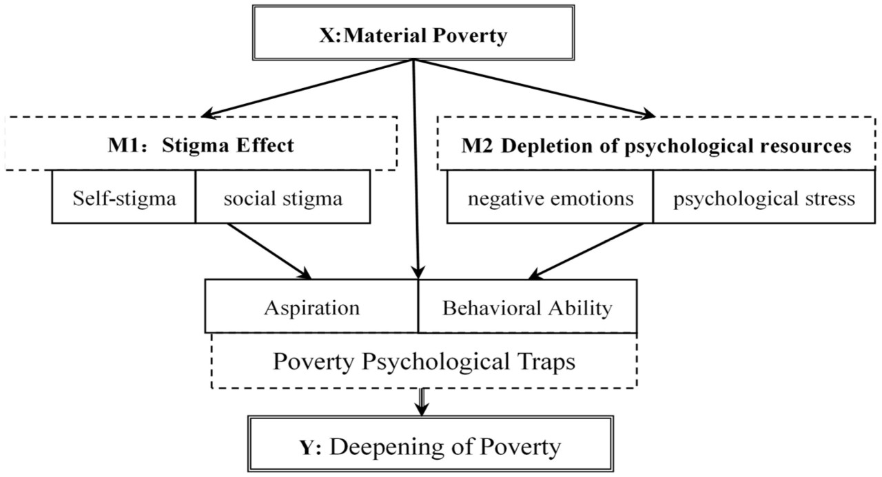 где M представляет собой опосредующие переменные, измеряющие влияние материальной бедности на психологическую бедность через «эффект стигмы» и «истощение психологических ресурсов».