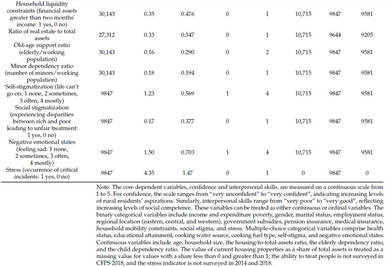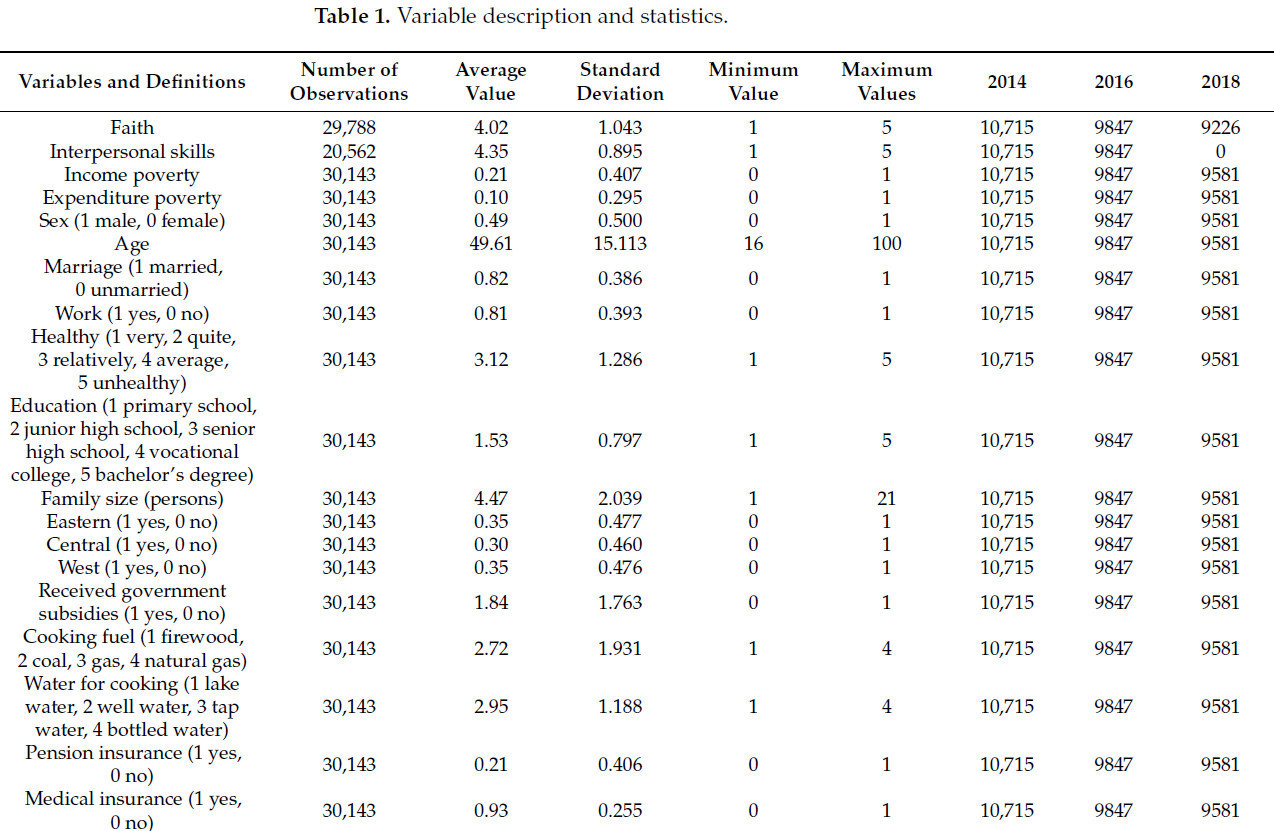 В исследовании сопоставляются данные опросов с 2014 по 2018 год на основе личных идентификаторов анкет для создания панельного набора данных. Учитывая акцент на сельской бедности, выборки регистрации городских домохозяйств были исключены. Выборки с отрицательными или отсутствующими значениями семейного дохода были исключены, что в общей сложности составило 30 143 наблюдения за три года. В очищенной выборке гендерное соотношение респондентов составляет 49%:51%; средний возраст — 49,61 года; 82% состоят в браке; 81% работают; а распределение по восточным, центральным и западным регионам составляет 35%, 30% и 35% соответственно, что указывает на относительно сбалансированное пространственное распределение.