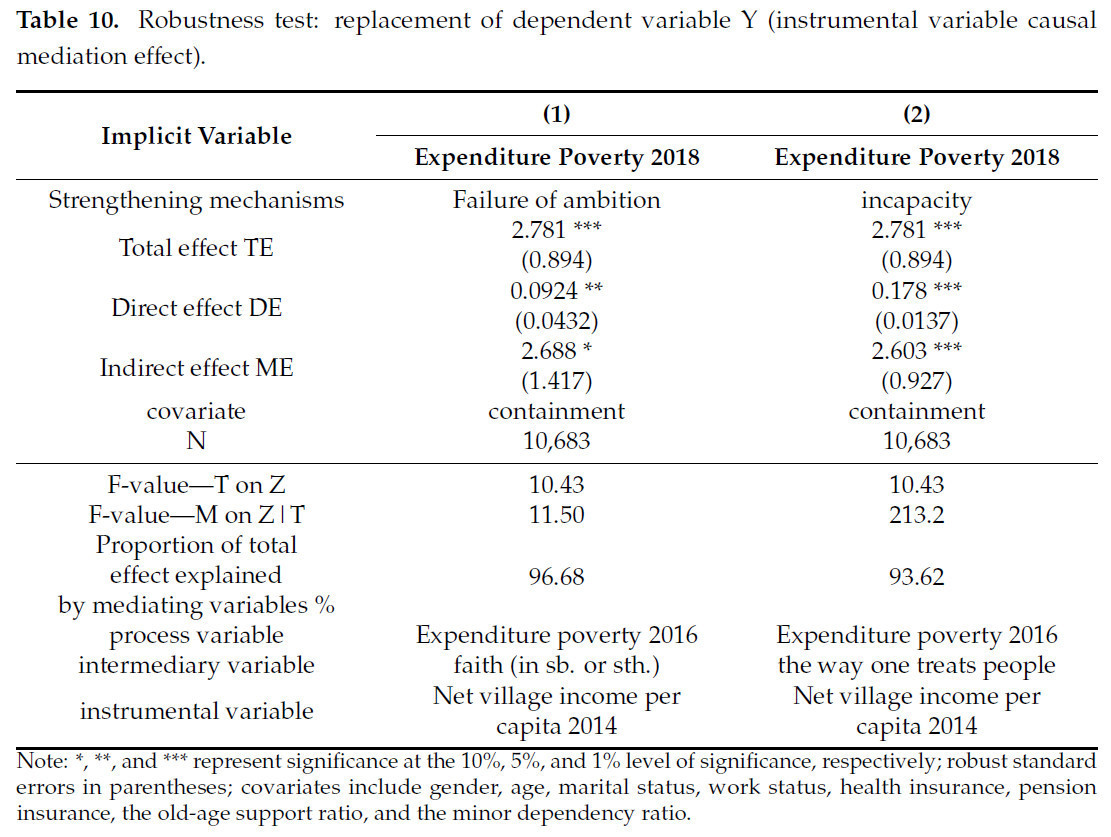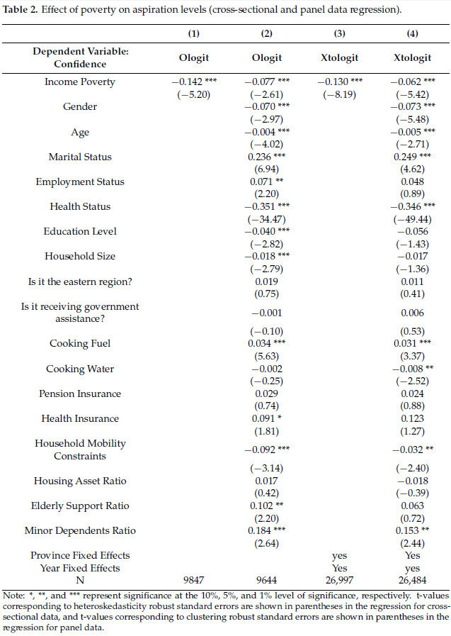 В таблице 2 представлены результаты регрессионного анализа влияния бедности по уровню дохода на уровень притязаний. В различных моделях, включая объединенный поперечный и панельный анализы данных с использованием оценок как OLS, так и Ordered Logit, результаты последовательно демонстрируют, что люди, живущие в бедности по уровню дохода, демонстрируют значительно более низкий уровень уверенности по сравнению с их небедными сверстниками. Анализ контролирует всесторонний набор переменных, включая индивидуальные факторы: пол, возраст, семейное положение, занятость, здоровье и образование; характеристики домохозяйства: государственные субсидии, размер семьи, тип топлива для приготовления пищи, доступ к воде, коэффициент владения жильем и коэффициент иждивенчества; региональные факторы: область и провинция; и политика социального обеспечения: пенсионное и медицинское страхование. После учета этих факторов результаты показывают, что в среднем отношение шансов уровней уверенности для бедных групп примерно на 0,075 ниже, чем для небедных групп.