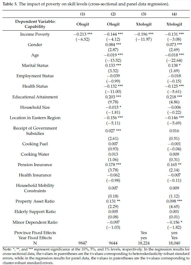 В таблице 3 показано влияние бедности, основанной на доходе, на индивидуальные возможности. Стратегия оценки согласуется с предыдущим анализом влияния бедности на уровни уверенности. Результаты базовой регрессии неизменно демонстрируют, что независимо от используемого метода оценки, бедные группы демонстрируют значительно более низкие уровни возможностей по сравнению с небедными группами. Другие примечательные результаты включают в себя следующее: мужчины демонстрируют значительно более высокие поведенческие возможности, чем женщины; уровни возможностей снижаются с возрастом; женатые люди демонстрируют более высокие возможности, чем неженатые; более слабое здоровье коррелирует с более низкими поведенческими возможностями; а более высокий уровень образования связан с более высокими поведенческими возможностями. Интересно, что относительно бедное население в восточных регионах демонстрирует более низкие поведенческие возможности, чем их сверстники в центральных и западных регионах; люди с пенсионным страхованием демонстрируют более сильные поведенческие возможности; ограничения ликвидности не оказывают существенного влияния на поведенческие возможности; и более высокое бремя воспитания детей коррелирует с более низкими поведенческими возможностями.