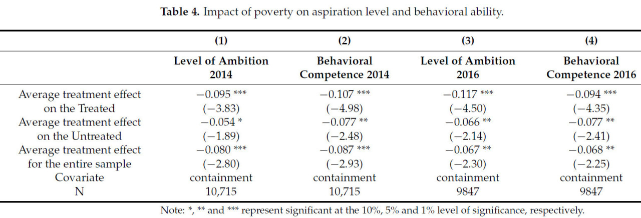Для дальнейшей изоляции причинно-следственного влияния материальной бедности на психологическую бедность был использован метод сопоставления показателей склонности (PSM). Этот метод максимально контролирует другие факторы, которые могут влиять на уровни уверенности и возможностей. Для анализа сопоставления показателей склонности (PSM) мы применяем отдельные процедуры поперечного сопоставления для волн данных 2014 и 2016 годов. Волна 2018 года исключена из анализа PSM, поскольку ключевая зависимая переменная, межличностные навыки, не была включена в анкету обследования CFPS 2018 года, что делает сопоставление для этой волны невозможным. Результаты, представленные в Таблице 4 , показывают средние эффекты воздействия, согласующиеся с базовыми регрессиями, что указывает на «чистое влияние» бедности на психологическую бедность. Хотя наши регрессионные анализы предоставляют убедительные доказательства значимой отрицательной связи между материальной и психологической бедностью, эти результаты устанавливают только корреляцию, а не причинно-следственную связь. Для выявления причинно-следственного влияния материальной бедности на различия в стремлениях и возможностях мы используем методологию сопоставления показателей склонности (PSM). Подход PSM сопоставляет бедные и небедные группы, контролируя другие потенциальные детерминанты уверенности и уровней возможностей. Мы рассчитываем три эффекта лечения: средний эффект лечения для леченных (ATT), средний эффект лечения для не леченных (ATU) и средний эффект лечения (ATE) для всей выборки. При эффективном контроле других факторов различия в уверенности и возможностях между бедными и небедными группами можно интерпретировать как «чистый эффект» материальной бедности на психологическую бедность. Постсопоставленные средние эффекты лечения материальной бедности на уровни притязаний и поведенческие возможности в значительной степени согласуются с нашими результатами регрессии исходного уровня, как показано в Таблице 4. Для краткости мы опускаем оценочные коэффициенты ковариатов, поскольку наше основное внимание сосредоточено на влиянии материальной бедности на психологическую бедность.